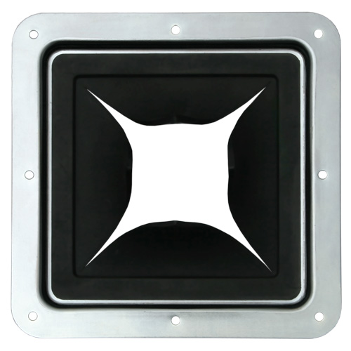 Recessed dish with crosswise slotted rubber flange to pass through connectors and cables. Delivered uncut.