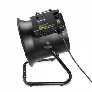 Adding touches of drama and dynamics to any event, the Cameo Instant Air 2000 Pro is a professional high velocity wind machine producing a powerful 56 m3 air flow per minute. It generates a wide range of wind effects from a gentle breeze to strong, heavy gusts sporting precision fan speed control in one percent increments and continuously adjustable air flow direction.The Instant Air 2000 Pro can be operated via DMX or in standalone mode and includes a convenient RF remote control. It features 3-pin and 5-pin DMX inputs and outputs, an easy-to-read LED display and virtually silent operation thanks to its ultra quiet 31 cm fan. Designed for both floor standing applications and hanging from trusses, the Cameo Instant Air 2000 Pro is ideal for fashion shows, film and photo studios, theatres, theme parks and live concerts. It is also the perfect addition to fog and haze machines and enhances their performance.