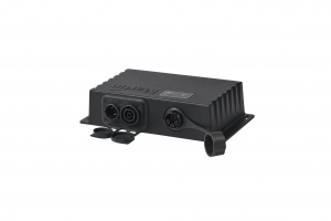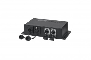 The Martin PDE Junction Box Active merges power, DMX and Ethernet signals into a single connector and cable system, as used by the Martin VDO Atomic family of fixtures.