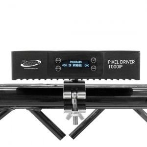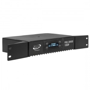 The Pixel Driver 1000IP features a rugged IP65 housing, universal auto switching power supply (100-240v), a 4-button LCD control menu display, RJ45 Ethernet in/out ports, and (4) outputs which use proprietary IP65 rated 4pin combo cables (sold separately) that supply power and data to each pixel bar, (available in lengths from 0.6 to 15 meters). The Pixel Driver 1000IP can be mounted in a standard 19-inch rack (rack ears included) or attached to truss with a clamp (not included).