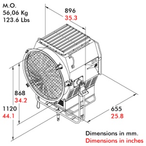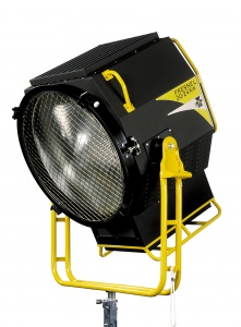 The SuperLeo 20.000W is a Fresnel lens spotlight properly designed for use in those situations where it is required to locate the luminaire far from the scene; its high quality performances in terms of photometric characteristics make this luminaire essential for the TV and Film Industry. The built-in dimmer, with a local/remote control selector, permits lamp ignition avoiding surge current shocks. A highly efficient air convection cooling system includes a wide top ventilation grid, for air flow/heat dissipation, featuring an internal baffle to either prevent direct water leaking on the lamp or avoid light spilling; double walls grant low temperature value on the external surfaces. A bottom sledge, a tubolar rear grab handle and a single tilt locking the locking knob ensure easy handling and orientation of the luminaire.