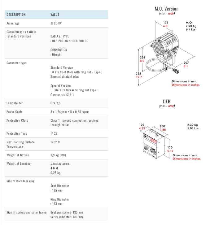 • High efficiency convection coolingGZY9.5 bi-post socket for Discharge Lamps (High Voltage Rating), with special contacts for homogeneous current distribution over lamp’s pinsSpecial bimetallic clad aluminum reflector for high degree of reflectivity and thermal resistance for long lifeWorn Screw driven focus mechanism which guides Teflon bushings supported lamp carriage along 2 steel rails. This ensures smooth operation, and restricts bouncing or chattering of the lamp carriage during focusing, in any tilting position of the fixture, avoiding lamp failures during operation. The Teflon bushings also provide a wiping action, which cleans the stainless steel guide rails during focus. The whole spot to flood action is accomplished with 1 and half turn of the focusing knobThe unit is equipped with a hinged lens door with wire-guard for easy access to the lamp, it includes accessory holding brackets. One of the 4 brackets has a locking knob and is spring loaded, it can be locked to either safely hold barndoor, color frame and scrims or to be rotated 90° and locked in an open position for fast accessories changes. A double safety accessory bracket with spring loaded catch is available on request to be assembled opposite to the locking knobThe accessories are secure regardless of the orientation of the fixture. Accessories have been designed for one hand installation