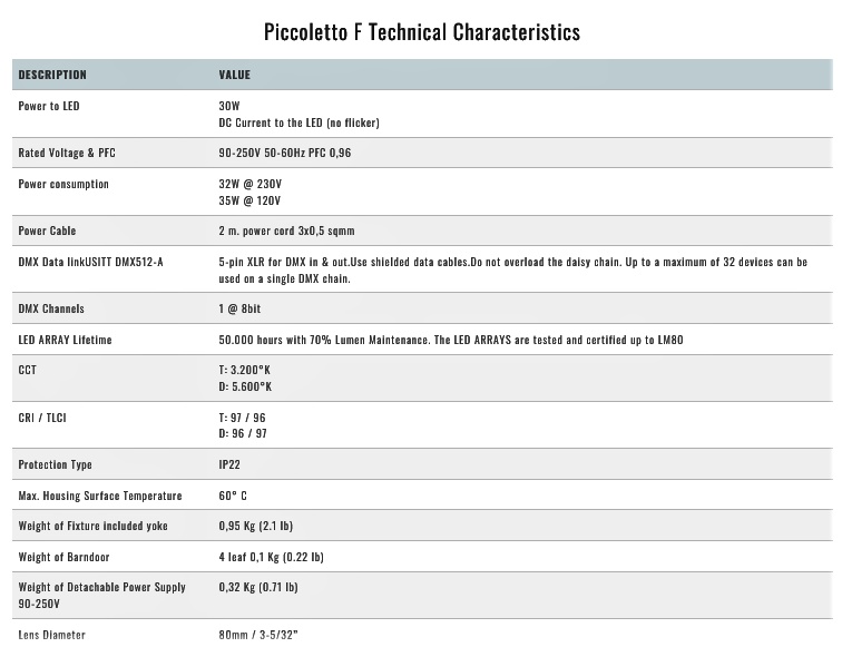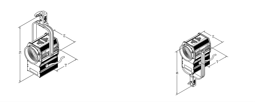• 1 kg self weight in battery operation configuration and 1,3 kg in mains operation configuration…..these values are including the 4 leaves rotating Barndoor.