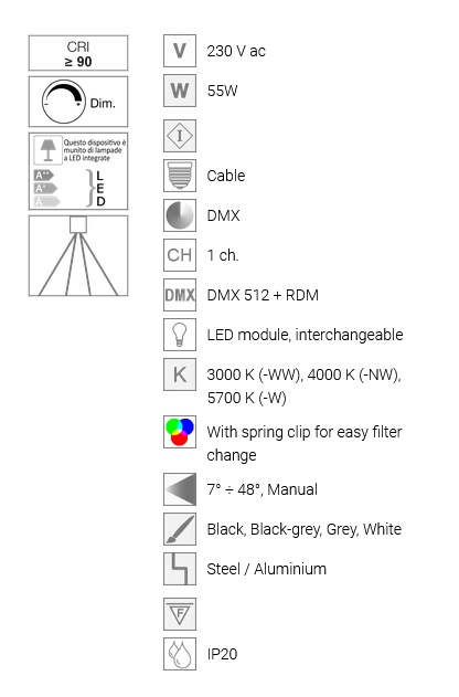 5700K, vysoké CRI> 90, manuálne nastaviteľný zoom 7° až 48°.