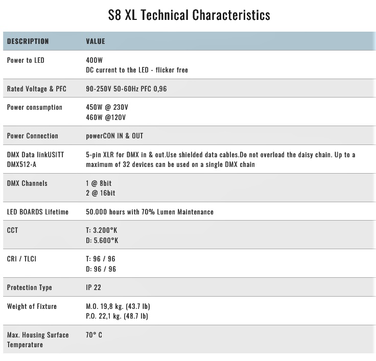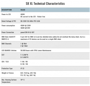 • DMX (or local) control of the Light intensity from 0 to 100% with smooth transition and theatrical quality dimming….flicker free at any dimming level