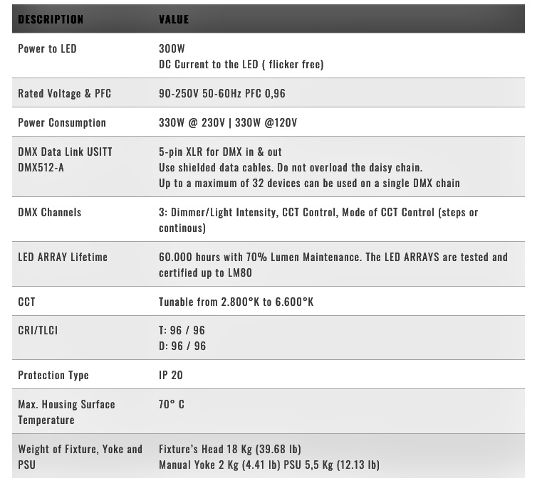 • As user requested the 300W Spacelight fixture is equipped with De Sisti Vari-White LED engine and precise +/- Green correction functionality produced with the proper LED to grant the same effect that you would have with the filters