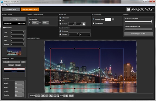 AW Screen Frame Cutter je aplikácia, ktorá vám pomôže rozdeliť ľubovoľný širokoúhly obraz na viacero obrázkov na pozadí buď v pravidelnom formáte pre vaše multi-projektorové Soft Edge blenfing(s prekrytiami), alebo v plne prispôsobenom formáte pre vaše multi-display inštalácia, starostlivosť o fyzické intervaly medzi displejmi.