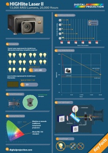 HIGHlite Laser II - ďalší skok vo vývoji projektorov!Výrazne jasný laser HIGHlite Laser II prináša ohromujúcich 13 000 lumenov zo stabilného a pevného svetelného zdroja, ktorý dokáže zabezpečiť viac ako 20 000 hodín osvetlenia. Vyvinutý pomocou technológie „Fit and Forget“ prináša efektívne zobrazovacie riešenie s minimálnou údržbou po celú dobu životnosti displeja. Bežný cyklus výmeny svetelného zdroja nie je potrebný. Táto kľúčová vlastnosť umožňuje, aby laser HIGHlite Laser II mal oveľa nižšie náklady na prevádzku.Pre miesta,kde potrebujete priniesť a prezentovať pútavú vizualizáciu s úspornými nákladmi na prevádzku je projektor HIGHlite Lase skvelým riešením.