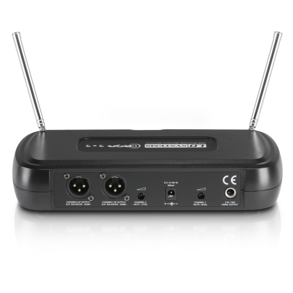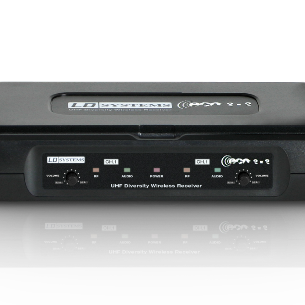 Operating in the 863.9 and 864.9 MHz bands, this ECO 2 Series 2-channel diversity receiver features balanced XLR outputs, an unbalanced 1/4” mix output plus level and squelch controls and LED status indicators for each channel.