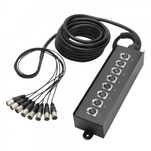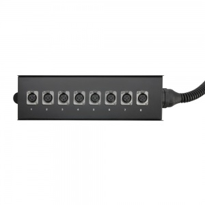Osemkanálový box s trvalo pripojeným desaťmetrovým káblom zakončeným ôsmimi konektormi Adam Hall XLR. Kovová pódiová skrinka má na boku montážny výstupok; masívne odľahčenie napätia chráni citlivú zónu prechodu medzi boxom a káblom. Dodatočne zosilnený prechod na koncovky zabraňuje únave a zlomeniu kábla.