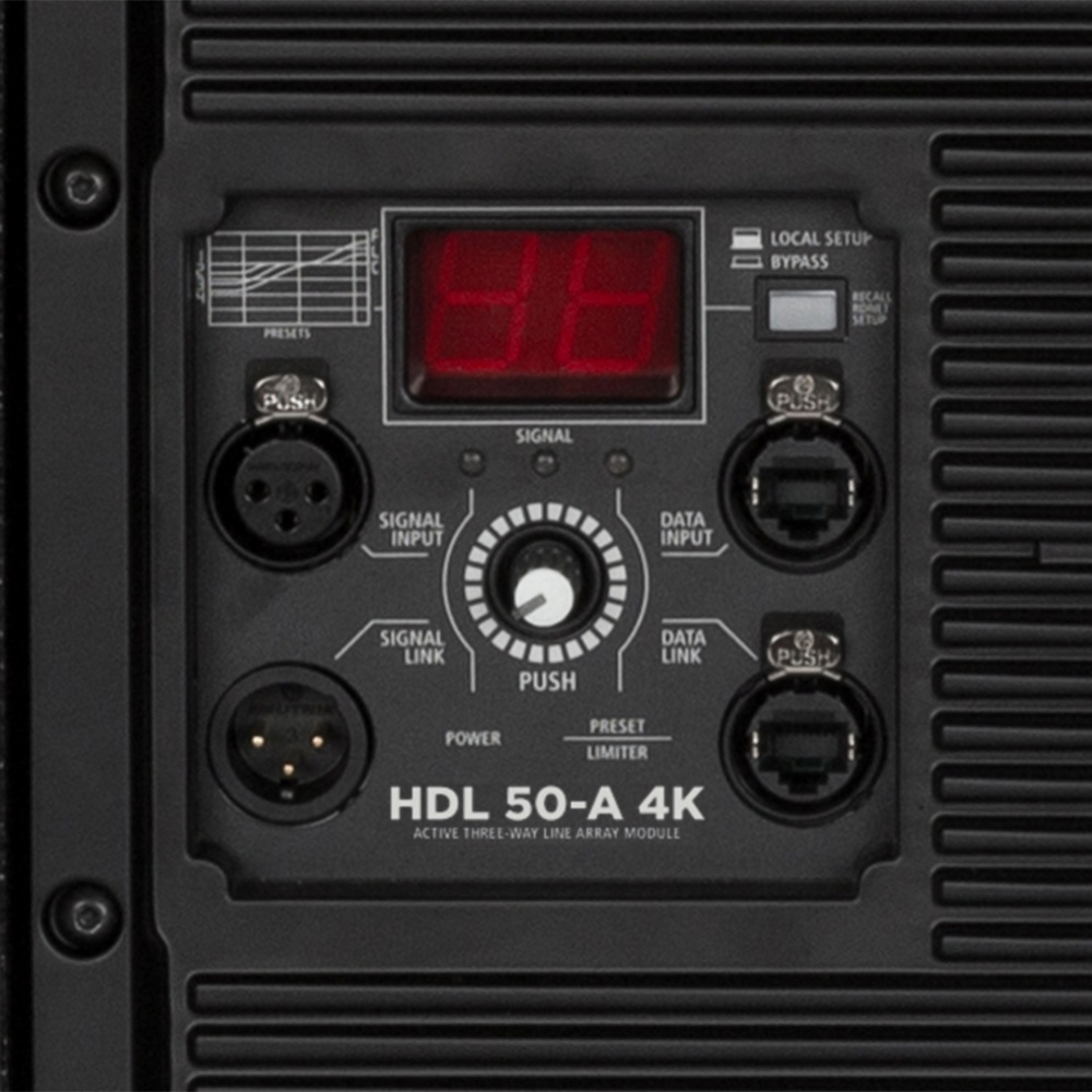 HDL 50-A 4K je aktívny trojcestný line array modul pre veľké akcie, vnútri aj vonku. Vyznačuje sa hladinou akustického tlaku 143 dB SPL so vstavaným 4-kanálovým zosilňovačom 8000 W PEAK a 4000 W RMS triedy D. Je vybavený ôsmimi prevodníkm,najlepšími vo svojej triede a ponúka vynikajúcu kvalitu, ideálnu pre profesionálne hudobné aplikácie. Patentovaný vlnovod 4PATH 90 x 10 stupňov so symetrickým dizajnom skrinky poskytuje optimálne pokrytie.