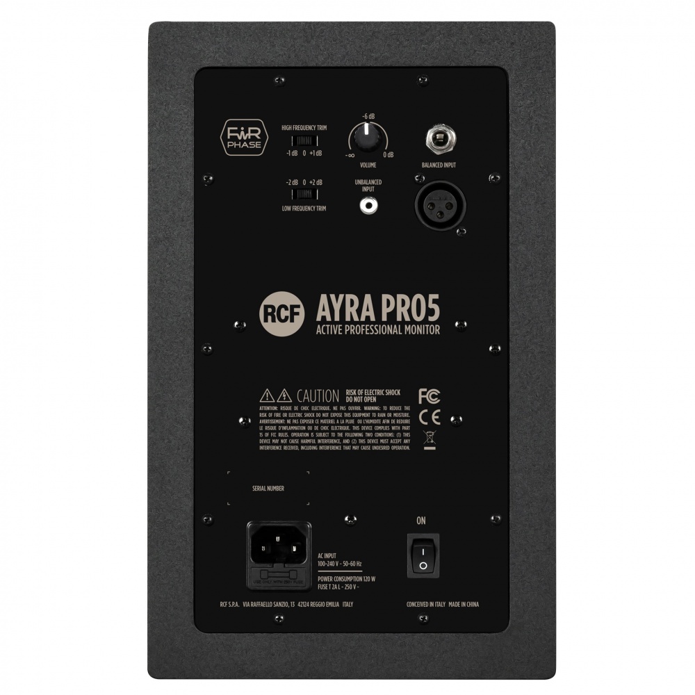 AYRA PRO5 studio monitor works perfectly in any listening environment, whether large or small production facilities, with absolute clarity. It delivers accurate monitoring and provides the engineer or producer with a neutral tool to analyze recordings and optimize the mix; for this reason, we call it PRO. Featuring a dedicated powerful internal DSP that optimizes frequency response and dynamics together with the exclusive RCF FiRPHASE processing and selected components, the AYRA PRO is the first Studio Monitor in its class to boast an outstanding 0° phase response.