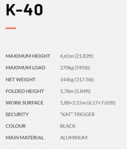 K-40 je nový rad hliníkových veží POLIVALENT schopných vyzdvihnúť KONŠTRUKCIE A PA AUDIO PA a LINE ARRAY SYSTÉMY zavedením nových výstužných profilov do základného profilu a väčším otvorom pre nohy. Hliníkové profily sú širšie a boli upravené tak, aby lepšie odolávali zaťaženiu ako jeho predchodcovia. 4 nohy s nastaviteľnými protišmykovými gumenými podšálkami. Automatická spúšť „KAT“ automaticky uzamkne sekcie pri zdvíhaní veže a zároveň chráni jej náklad v nepravdepodobnom prípade, že dôjde k pretrhnutiu kábla.