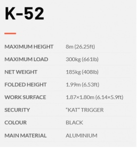 K-52 patrí do nového radu hliníkových veží KUZAR POLIVALENT, ktoré sú schopné zdvihnúť KONŠTRUKCIE aj AUDIO PA alebo LINE ARRAY systémy pretože kombinuje presné otvorenie nôh, aby vytváralo pole so špeciálnymi výstuhami.Okrem toho obsahuje spúšť „KAT“ v dvoch polohách, ktorá automaticky uzamkne sekcie pri zdvíhaní veže a chráni jej náklad v nepravdepodobnom prípade, že dôjde k pretrhnutiu kábla.