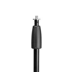 This microphone boom stand is made of hardwearing steel tubing with black powder coating finish. It features a durable tripod base with locking leg that eliminates the need for a set screw. Folding the locking leg halfway allows you to slide the leg collar up and down the shaft, folding it to the upper or lower stop locks the collar in place for quick setup or compact transport.