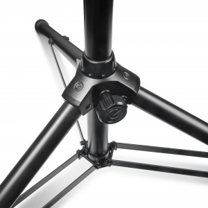 Stojan reproduktorov série Gravity Touring. Mimoriadne odolný, s tromi dvojito vystuženými nohami a montážnou konzolou z tlakovoho liateho hliníka. Obzvlášť silné oceľové rúrky s nosnosťou 50 kg. Nastavovanie a vyberanie je mimoriadne rýchle a bezpečné vďaka automatickému zacvakávaniu LockPin®. 35 mm predlžovacia tyč je zaistená na svojom mieste a čap je možné odblokovať iba pomocou uvoľňovacej páky. Stojan reproduktora je možné nastaviť na výšku až 194 cm. Zaisťovacie skrutky s pevnými neodopínateľnými kovovými gombíkmi sú pri turné neoceniteľnou výhodou.