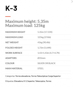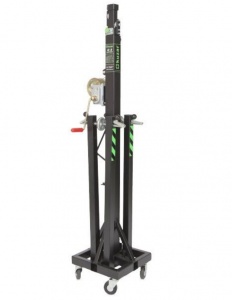 Teleskopický kľukový stojan dosahujúci dôležitých 5,35 metra maximálnej výšky. Táto veža je určená aj na zdvíhanie ľahkých konštrukcií, no už pridáva oveľa robustnejšiu základňu zo štvorcových oceľových profilov so štyrmi kolesami, vďaka ktorým je preprava hračkou. Má štyri nohy s nastaviteľnými protišmykovými gumovými doskami. Bezpečnosť zaisťuje naša automatická spúšť KAT, ktorá automaticky uzamkne sekcie pri zdvíhaní veže a zároveň chráni jej náklad v nepravdepodobnom prípade, že dôjde k pretrhnutiu oceľového lanka Ø4 mm.
